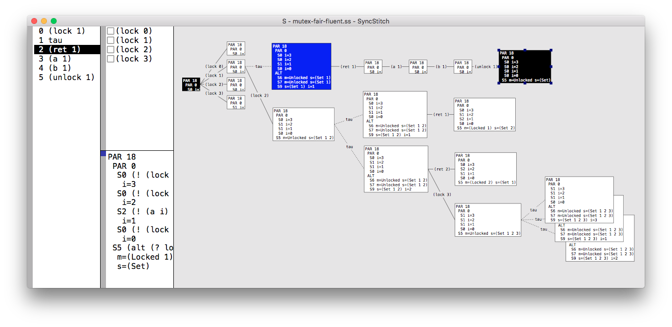SyncStitch is a model checker based on the process algebra CSP (Communicating Sequential Processes). By using SyncStitch, you can check six types of properties of the system you are developping: